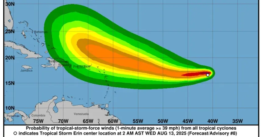 El Centro Nacional de Huracanes (NHC, en inglés) de Estados Unidos advirtió este miércoles que la tormenta tropical Erin, con potencial de convertirse este jueves en un huracán de gran intensidad, podría desviarse hacia el norte al aproximarse al Caribe, lo que la alejaría de Puerto Rico.