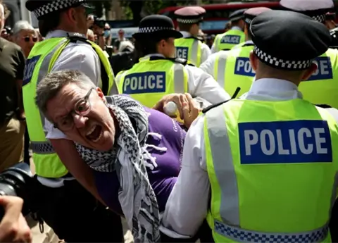 Los agentes continuaban desalojando a los manifestantes, que se encontraban sentados en silencio, portando carteles de respaldo a Palestine Action. Tras la prohibición oficial del grupo el pasado 5 de julio, exhibir apoyo público hacia él se considera un acto delictivo.