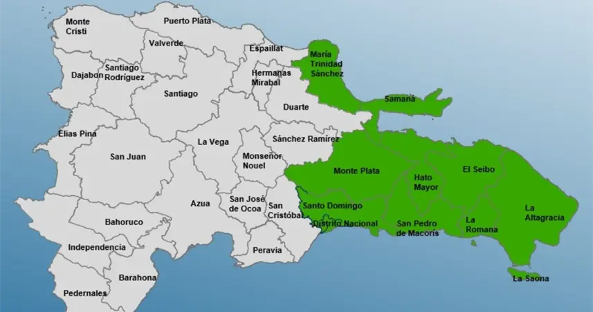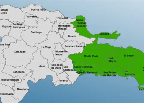 Estas lluvias serán frecuentes en Hato Mayor, El Seibo, La Romana, San Pedro de Macorís, Santo Domingo, Monte Plata, Samaná, San Cristóbal, Sánchez Ramírez, Azua, Peravia, La Vega, Elías Piña, San Juan e Independencia.