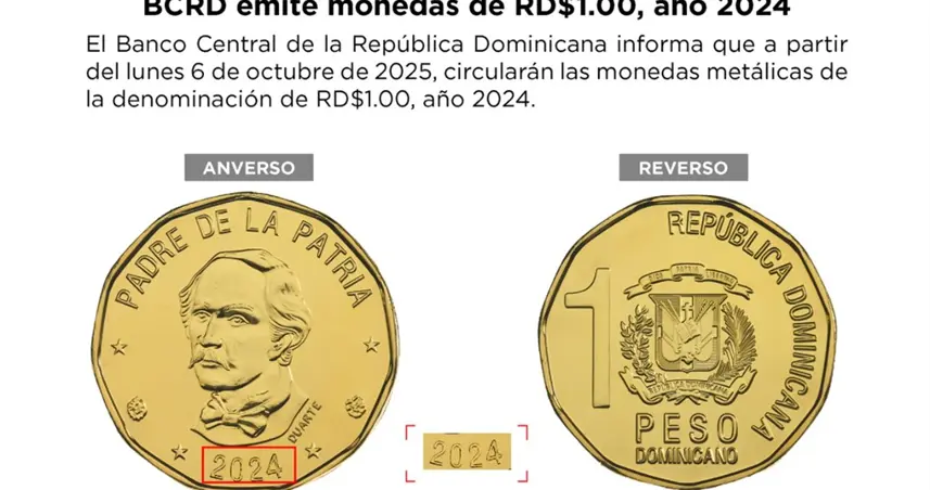 Santo Domingo.– El Banco Central de la República Dominicana (BCRD) informó que a partir del lunes 6 de octubre de 2025 entrarán en circulación las monedas metálicas de un peso dominicano (RD$1.00) correspondientes al año 2024.