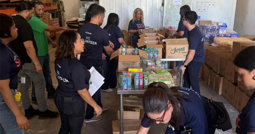 Colaboradores de otras empresas trabajan en las del Banco de Alimentos apoyando la preparación de los kits de asistencia que serán distribuidos en Ocoa, garantizando que la ayuda llegue de manera eficiente y oportuna a las familias más afectadas.