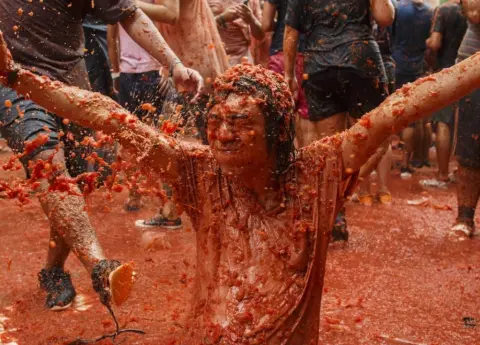 Más de 22,000 personas combaten a tomatazos en la popular fiesta española de la Tomatina