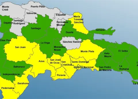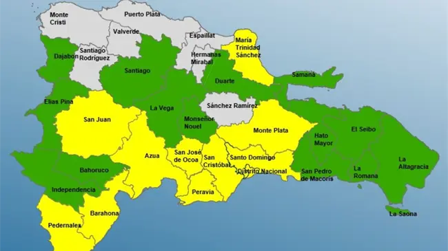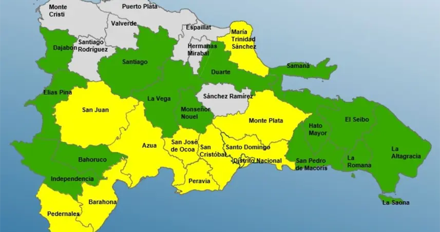 Alerta amarilla (11 provincias y el DN): Santo Domingo, Distrito Nacional, María Trinidad Sánchez, Barahona, San Juan, San Cristóbal, Monte Plata, San José de Ocoa, Pedernales, Azua y Peravia.