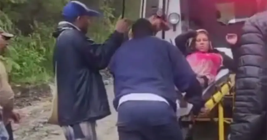 - En el video se observa cómo varias personas ayudan a la joven embarazada a cruzar el río, mientras una ambulancia del 9-1-1 espera para trasladarla al hospital más cercano.