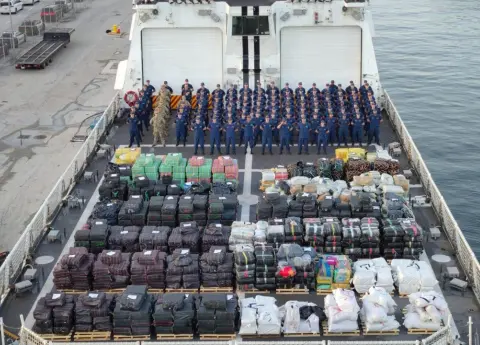 "La Guardia Costera de Estados Unidos logró un hito histórico con la descarga de 76.140 libras (34.536 kilogramos) de narcóticos ilícitos, valorados en 473 millones de dólares, lo que marca la mayor cantidad de drogas descargadas en la historia de la Guardia Costera", informaron los guardacostas en un comunicado.