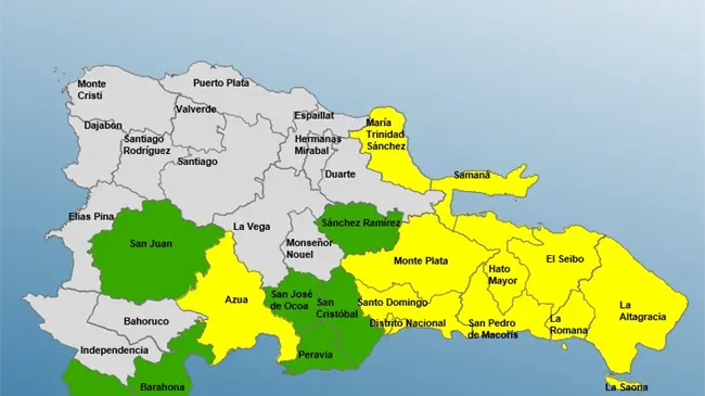 - De acuerdo con el boletín del Instituto Nacional de Meteorología (INDOMET), las precipitaciones afectan actualmente a La Altagracia, El Seibo, La Romana, San Pedro de Macorís, Hato Mayor, Monte Plata, Peravia, Azua, San Juan, Elías Piña, Dajabón, Santiago Rodríguez, Santiago y Puerto Plata, y se espera que se extiendan hacia Barahona, San Cristóbal, Santo Domingo, San José de Ocoa y Samaná, entre otras.