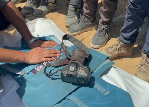 Los cuerpos fueron llevados en camillas desde el hospital Naser. Junto a ellos, descansaban sus chalecos de prensa y las cámaras: algunas intactas, otras marcadas por la sangre y el polvo y otras destrozadas tras el ataque.