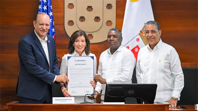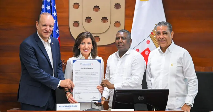 Santiago.– En un acto celebrado este lunes en la Sala Capitular de la Alcaldía de Santiago, la gobernadora del estado de Nueva York, Kathy Hochul, recibió la llave simbólica de la ciudad y fue reconocida como visitante distinguida, en el marco de su primera visita oficial a la República Dominicana.