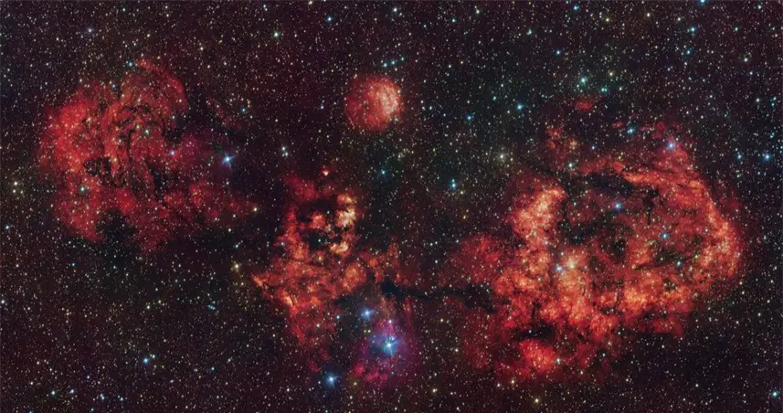 Las estrellas infantiles de su interior liberan la suficiente energía como para excitar los átomos de hidrógeno de su alrededor, haciéndolos brillar con el intenso tono de rojo.