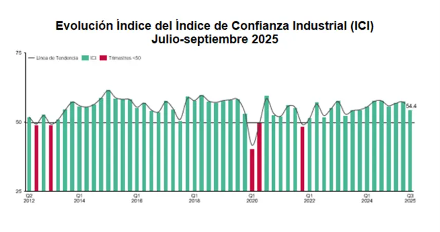 El Índice de Confianza Industrial (ICI), mide las percepciones sobre ventas, producción e inventarios, y se mantuvo en zona de expansión. Su leve corrección a la baja no impide que refleje expectativas positivas en el corto plazo.
