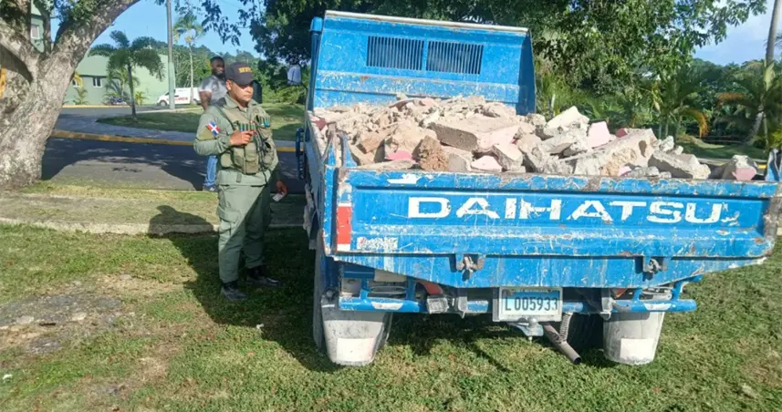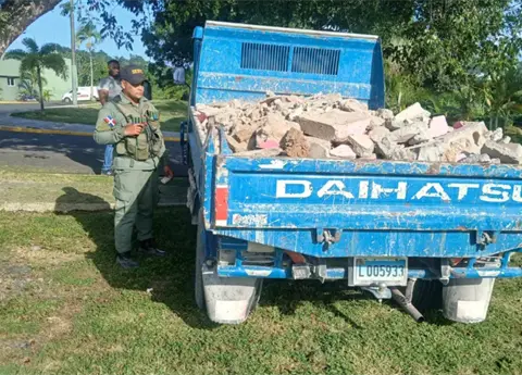 También en Bávaro, provincia La Altagracia, fue detenido un camión marca Mack, color blanco, por transportar material de la corteza terrestre sin los permisos exigidos por la ley. El vehículo fue trasladado al destacamento de la Armada en Cabeza de Toro, y su conductor a la Dirección Provincial de Medio Ambiente.