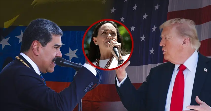 La líder de la oposición venezolana María Corina Machado; el presidente de Venezuela, Nicolás Maduro; y el presidente de Estados Unidos, Donald Trump.