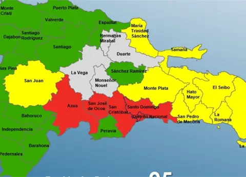 En alerta roja están el Distrito Nacional, Santo Domingo, San Cristóbal, San José de Ocoa, y Azua.