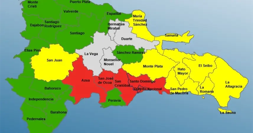 Mientras que en verde están Monte Cristi, Dajabón, Santiago Rodríguez, Valverde, Puerto Plata, Espaillat, Hermanas Mirabal, Elías Piña, La Vega, Monseñor Nouel, Bahoruco, Independencia, Pedernales y Sánchez Ramírez.
