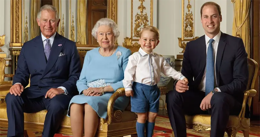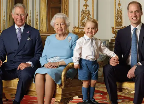 El príncipe Guillermo junto a sus abuelos el príncipe y la reina Isabel II, y su hijo el Príncipe Jorge.