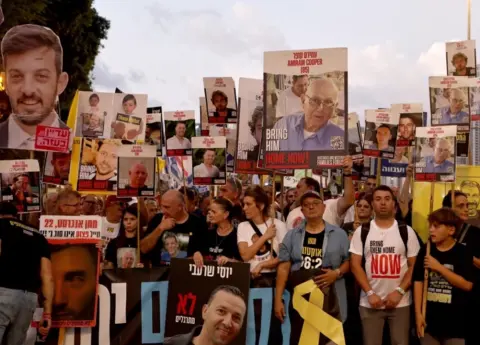 Imágenes difundidas en redes sociales y una retransmisión en directo del Foro de Familias de Rehenes y Desaparecidos -que representa a la mayoría de los familiares de los secuestrados- muestran a los manifestantes portando carteles con las fotos de los rehenes, además de banderas israelíes y amarillas, estas últimas en señal de apoyo a los cautivos.