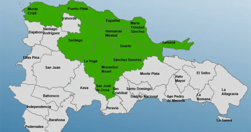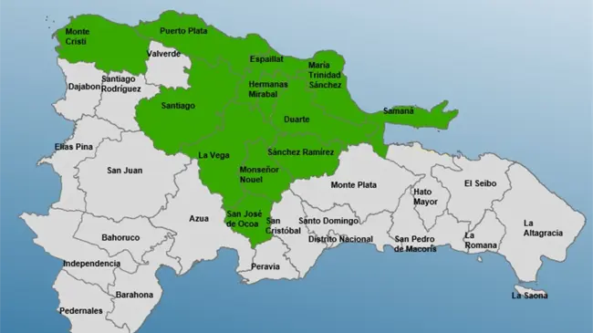 Las provincias bajo alerta verde son: Montecristi, Puerto Plata, Espaillat, María Trinidad Sánchez, Samaná, Hermanas Mirabal, Monseñor Nouel, La Vega, Duarte, Sánchez Ramírez, Santiago y San José de Ocoa.
