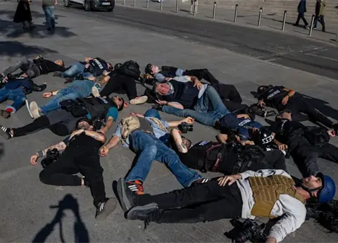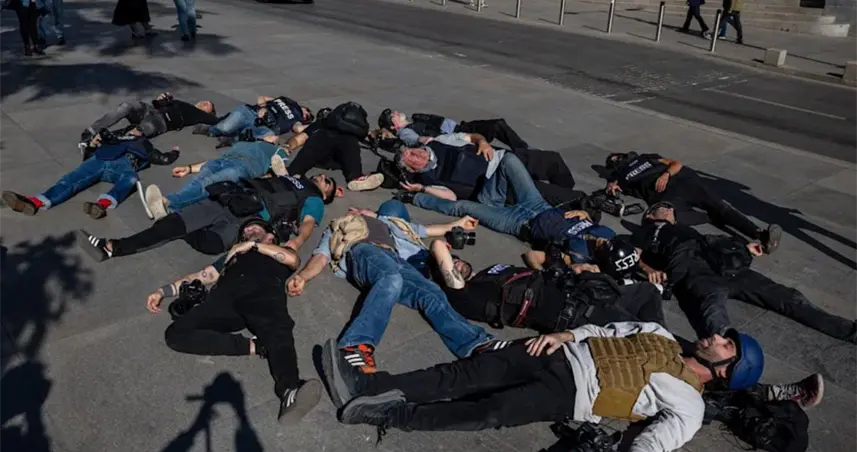 Provistos de chalecos antibalas y cascos, se tumbaron en el suelo en recuerdo de los más de 250 periodistas y empleados de los medios de comunicación asesinados en Gaza tras los "terribles" atentados del 7 de octubre de 2023 y la "desproporcionada" respuesta del Gobierno de Benjamin Netanyahu.
