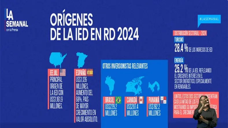 Durante el 2024, la República Dominicana recibió un total de US$619.19 millones en IED, con Estados Unidos como el principal inversor, seguido por España, que aumentó su inversión en US$126 millones. Otros inversionistas relevantes incluyen a Brasil, Canadá y Panamá, lo que demuestra la diversificación y el atractivo del país como destino de inversión.