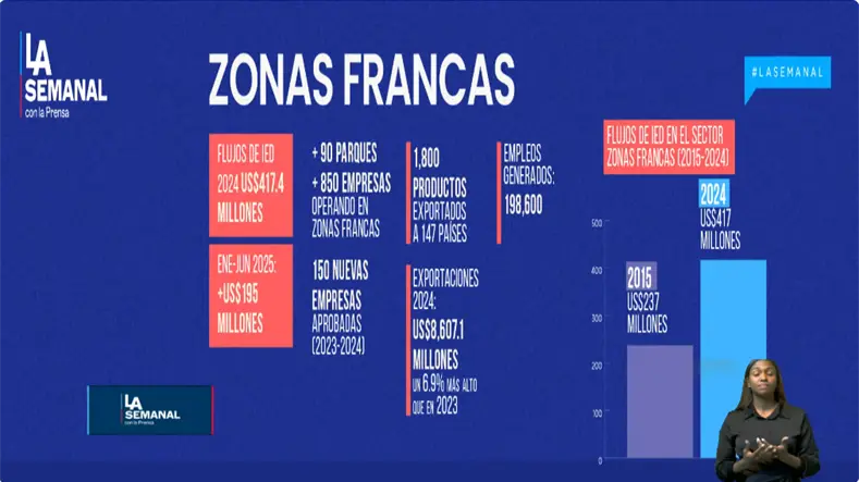 Las zonas francas continúan siendo un pilar del crecimiento económico, con flujos de IED que alcanzarán US$147.4 millones en 2024. Se han aprobado 165 nuevas empresas en este sector, lo que refleja la continua expansión de la economía dominicana.