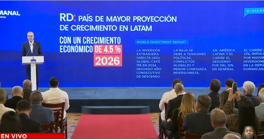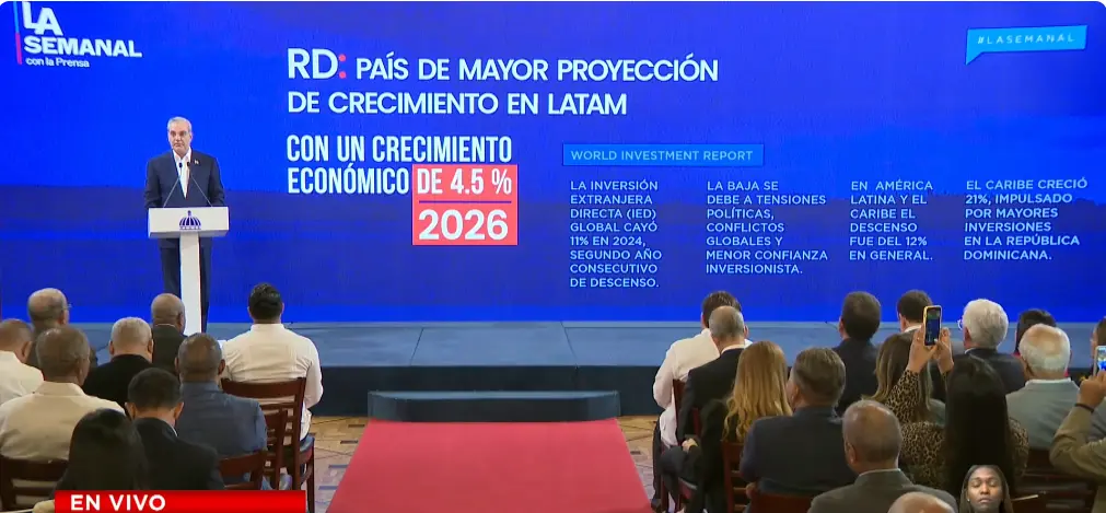 Santo Domingo.– La República Dominicana se posiciona como el país con mayor proyección de crecimiento en América Latina, con un crecimiento económico estimado del 4.5% para el año 2026, según el último informe de la Inversión Extranjera Directa (IED) de 2024 presentado por el presidente Luis Abinader en La Semanal con la prensa.